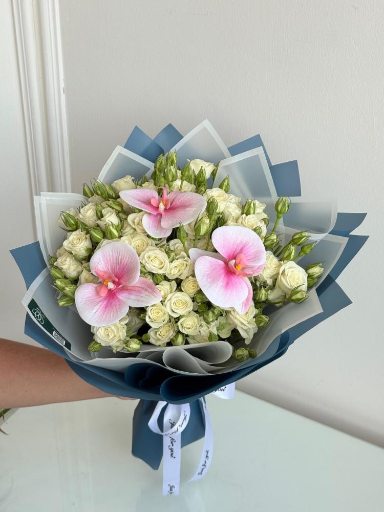 تُعبّر هذه الباقة الفاخرة بحجمها الكبير عن الجمال والرقة من خلال الون الابيض والوردي الذي يتنقل بين الفاتح والغامق، يضيف عمقًا وتناسقًا بصريًا رائعًا. الورود المختارة بعناية تتناغم مع بعضها لتخلق مزيجًا يبعث على الهدوء والسكينة، مما يجعلها الاختيار المثالي لمختلف المناسبات.